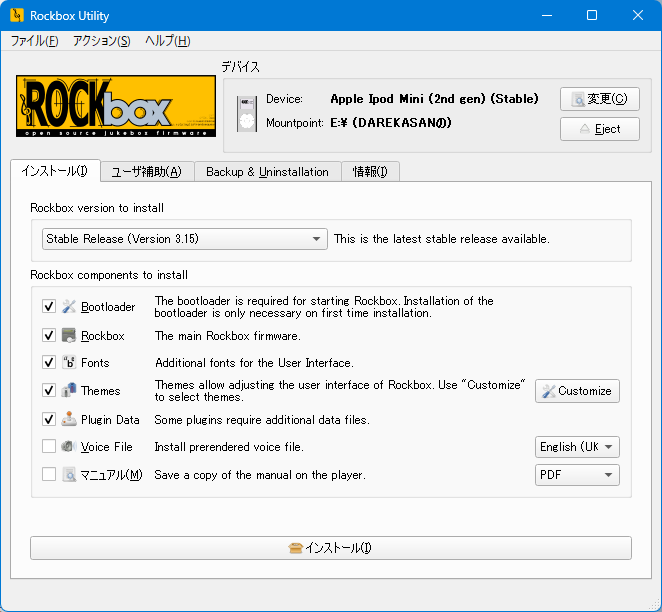 Rockbox Utilityで簡単に導入が可能。通常より大容量なためか、Stable versionではうまくブートしなかったのでDevelopment versionを導入した。