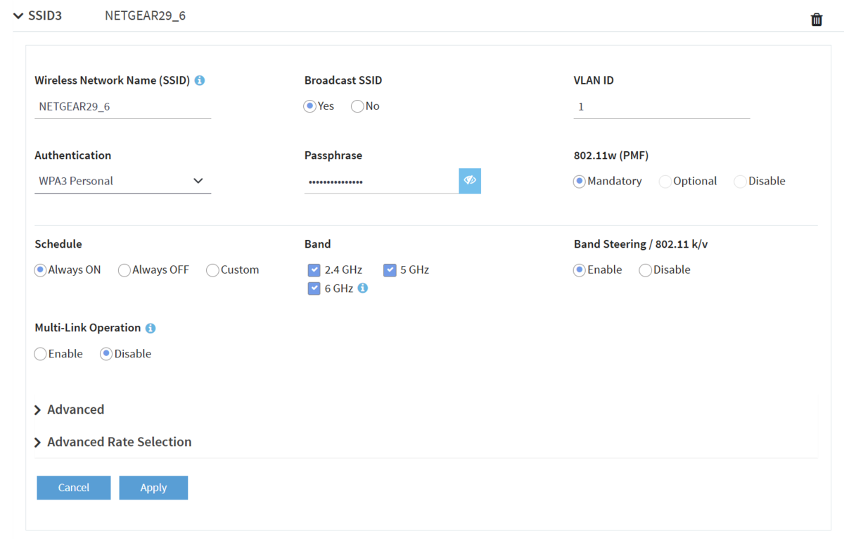 WPA2までしか対応していない機器の接続を考えて、6GHz帯を使うSSIDと2.4GHz/5GHz帯を使うSSIDをわけて設定した。